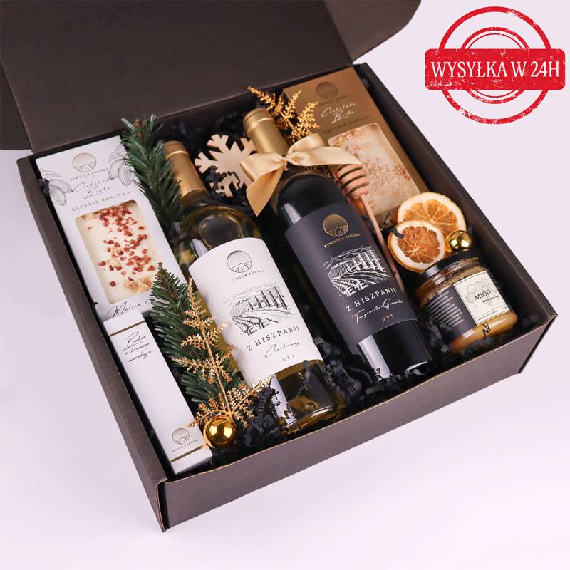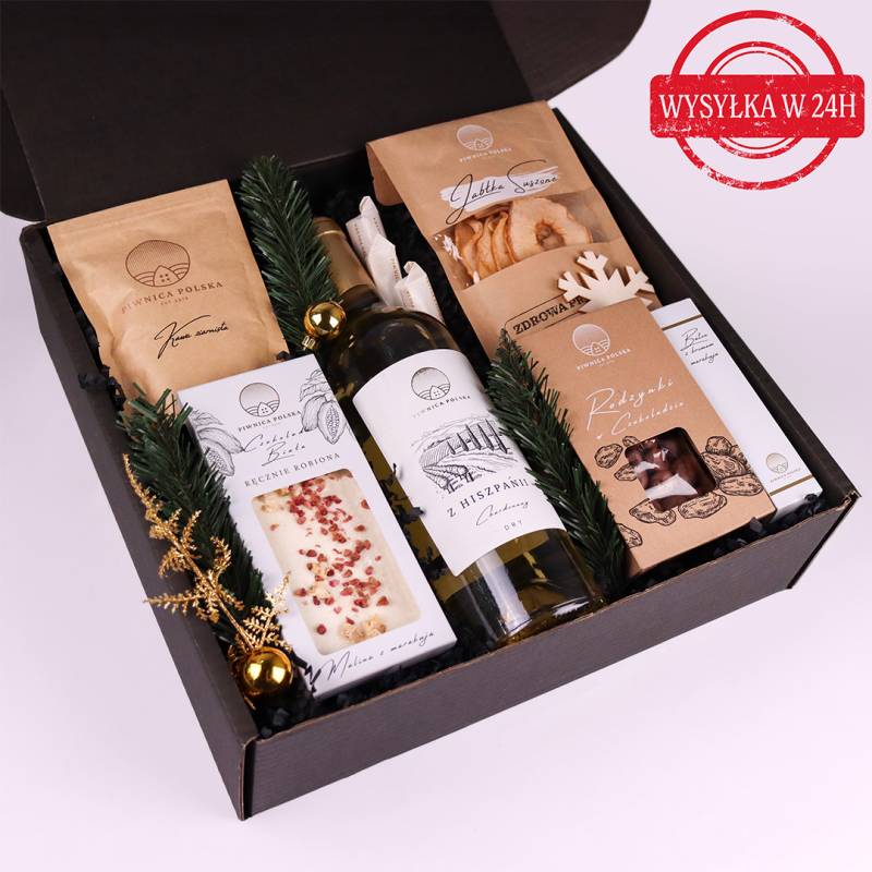 Kosz prezentowy z winem i słodyczami