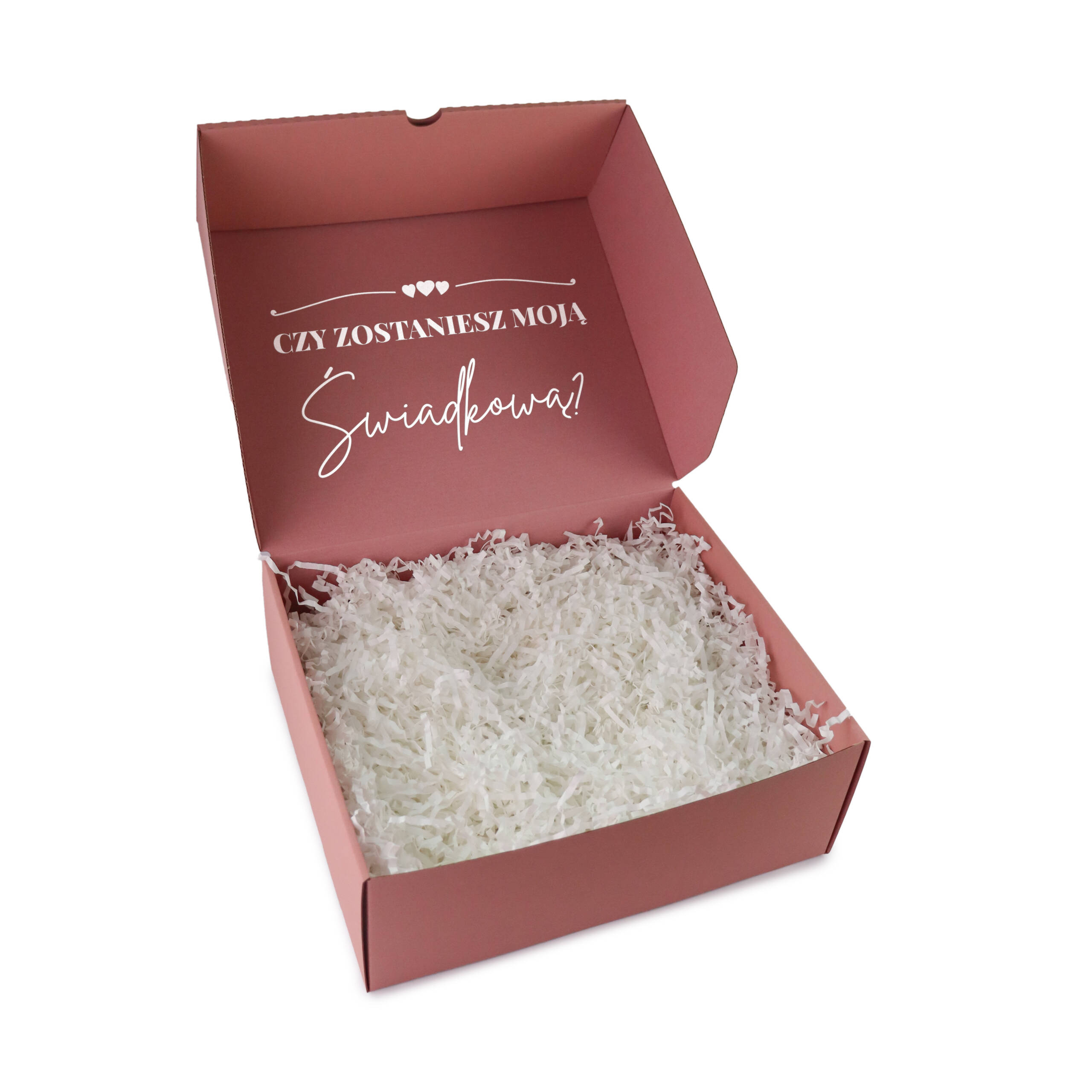 Już na pierwszy rzut oka uwagę przyciąga subtelny napis na wieku „Mam do Ciebie pytanie”, który intryguje i wprowadza odbiorcę w nastrój oczekiwania. Po otwarciu pudełka pojawia się właściwa treść – „Czy zostaniesz moją Świadkową?”, która nadaje całości wyjątkowego, osobistego charakteru.