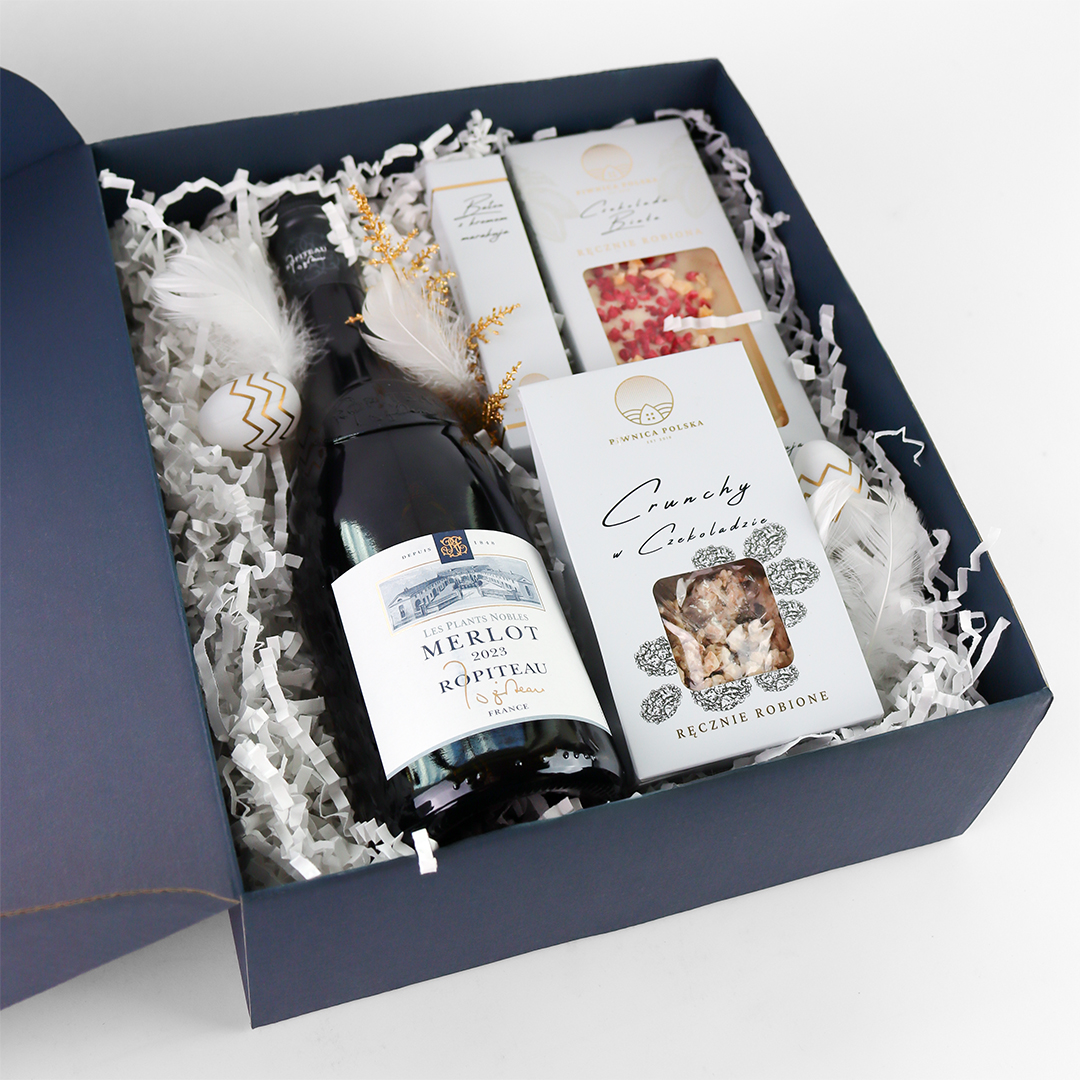 Zestaw Prezentowy „Owocowa Wielkanoc” to harmonijne połączenie czerwonego wina i słodkich, owocowych akcentów, które doskonale wpisują się w klimat wiosennych świąt. To propozycja dla osób, które cenią eleganckie prezenty i wyważone kompozycje smakowe – idealna na wielkanocny stół lub jako wyjątkowy gest wobec bliskich i partnerów biznesowych.