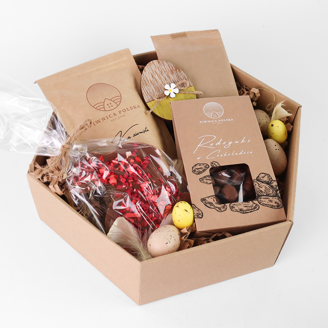 Całość zapakowana jest w estetyczne opakowanie z ozdobami, dzięki czemu prezentuje się elegancko i nie wymaga dodatkowego przygotowania. „Wielkanocna Klasyka” to prosty, ale dopracowany zestaw, który łączy tradycję, smak i świąteczną atmosferę w jednej, spójnej formie.