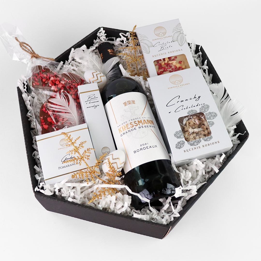 W centrum kompozycji znajduje się Wino Kressmann Grande Réserve 0,75 l – wyraziste i szlachetne, doskonałe na uroczysty toast w gronie rodziny lub przyjaciół. Jego charakter świetnie współgra z deserowymi dodatkami, tworząc harmonijną całość.