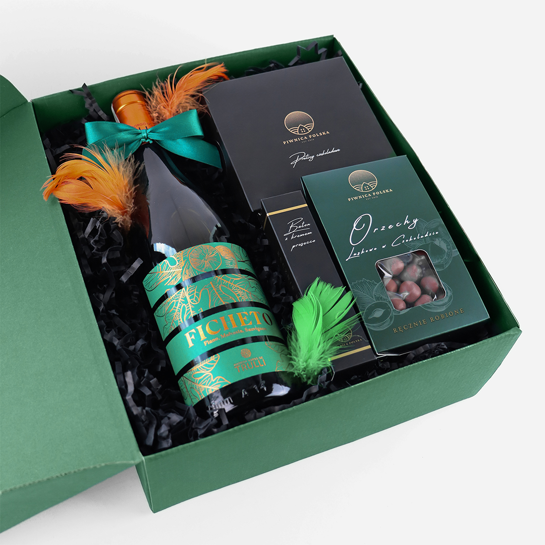 Słodką część zestawu buduje mix 9 pralin czekoladowych (81 g), które zachwycają różnorodnością smaków i nadają prezentowi bardziej luksusowego charakteru. Towarzyszy im baton czekoladowy z kremem Prosecco (35 g), wprowadzający subtelną, deserową nutę, oraz orzechy laskowe w czekoladzie (100 g), które dodają przyjemnej chrupkości i klasycznego czekoladowego akcentu.
