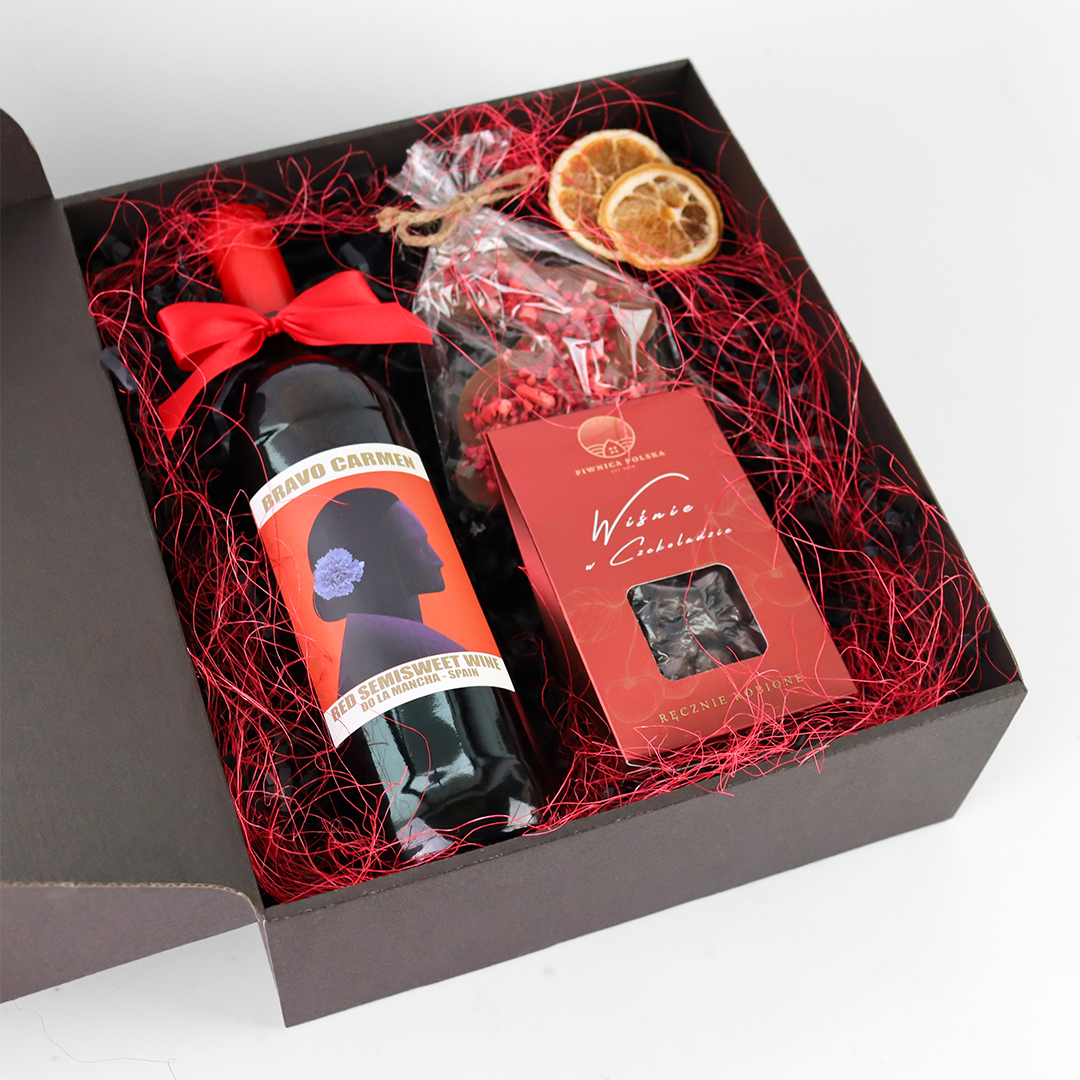 Wyjątkowy smak zapewniają wiśnie w czekoladzie (100 g) – klasyczne połączenie owocowej soczystości i deserowej słodyczy, które świetnie pasuje do lampki czerwonego wina. Wielkanocny klimat podkreśla czekoladowy zajączek (85 g), który wprowadza radosny, tradycyjny akcent i sprawia, że zestaw nabiera świątecznego charakteru.